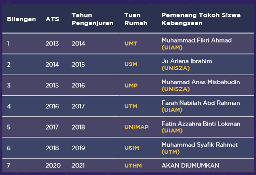 Anugerah Tokoh Siswa merupakan anugerah yang dapat mengiktiraf dan memberi galakan kepada mahasiswa yang telah banyak berusaha untuk menjadi modal insan yang holistik dan kompeten selari dengan kehendak ekonomi serta pembangunan masa kini. Oleh yang demikian, Majlis Anugerah Tokoh Siswa yang pertama kali telah berjaya dilaksanakan pada 1 Mac 2013. Selaras dengan Lonjakan 1 Pelan Pembangunan Pendidikan (Pengajian Tinggi) 2015-2025, Kementerian meneruskan pengktirafan tersebut dengan menganjurkan Majlis Anugerah Tokoh Siswa bagi melahirkan mahasiswa yang seimbang dari segi ilmu dan akhlak. Ini adalah kerana melalui program- program kepimpinan dan kesukarelawanan yang dilaksanakan oleh mahasiswa, mereka berupaya meningkatkan kemahiran berfikir, kemahiran bahasa, kemahiran dalam kepimpinan, etika dan rohani serta meningkatkan tahap integrasi dan perpaduan nasional. Sejarah penganjuran Anugerah Tokoh Siswa adalah seperti berikut: